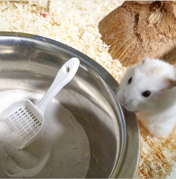 Pieni hiekkalapio jolla voi putsata kätevästi jyrsijän kylpyhiekka- tai vessa-astian.