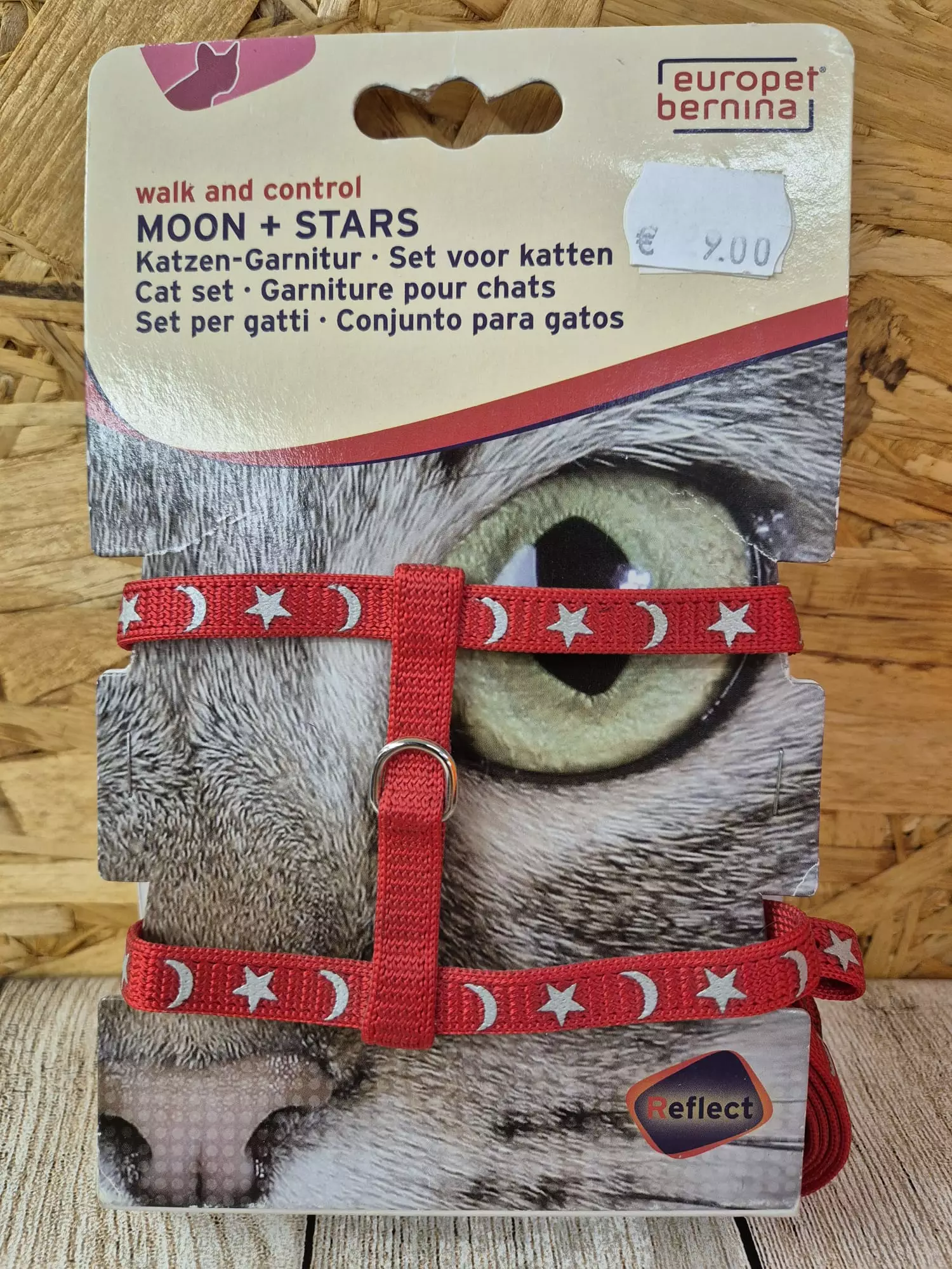 Kissan valjaat säädettävissä välillä 25-38 cm. Hihnan åituus 110 cm. Väri: punainen, tähti ja kuu -kuvoilla. Poistuva tuote.