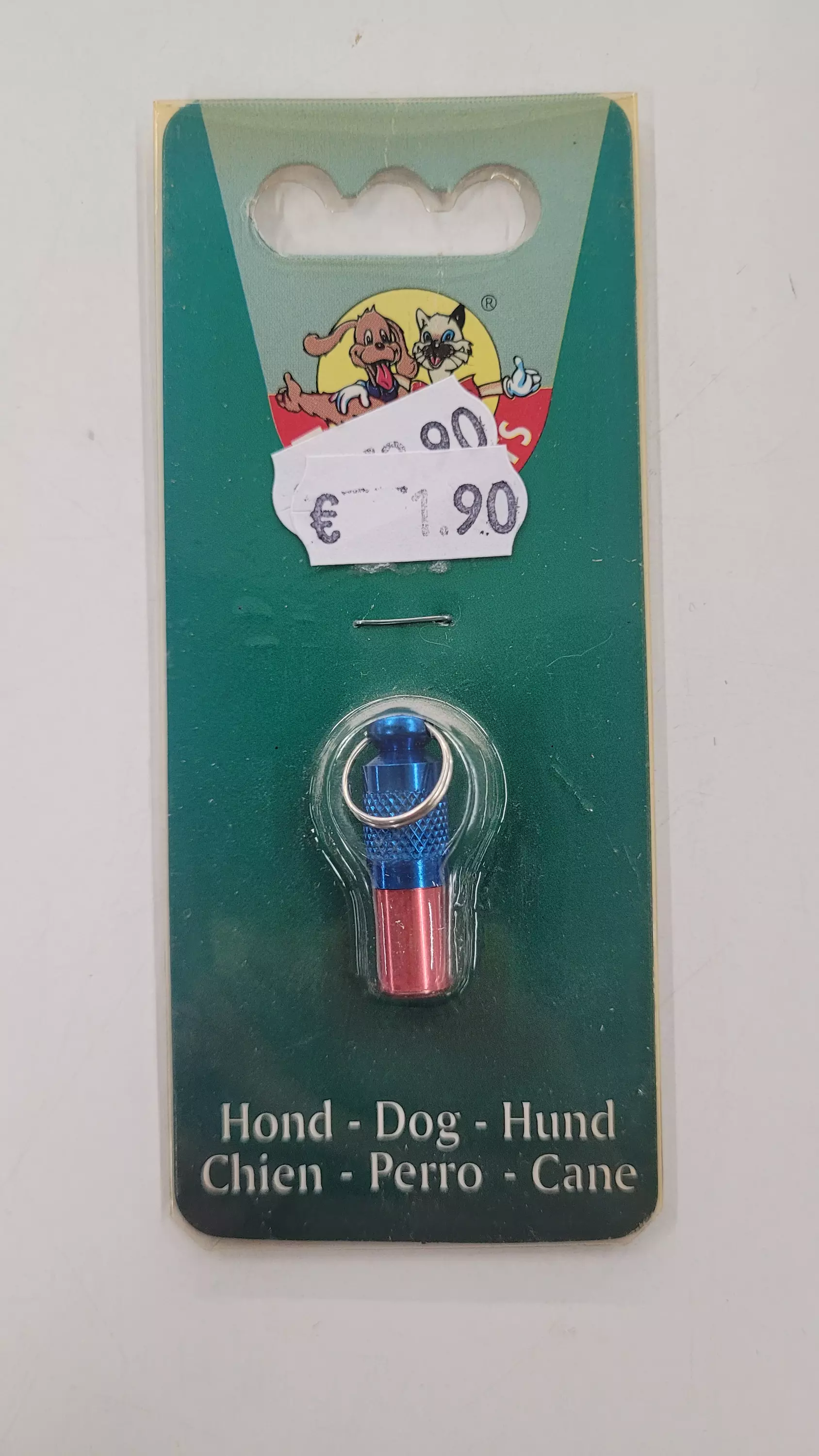 Kapseli, johon saa kirjoittaa tiedot sisälle. Puna-sininen.