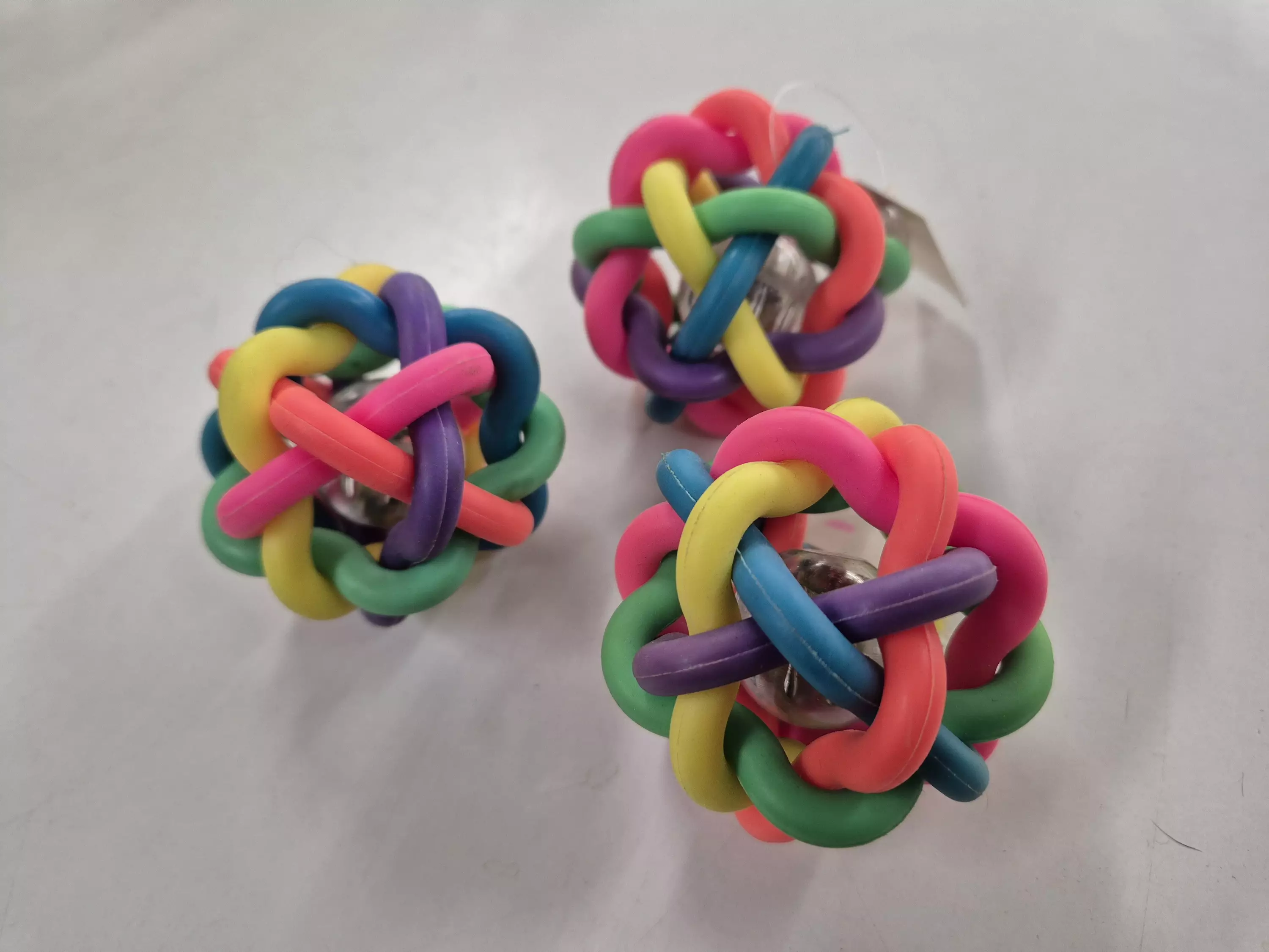 Värikäs joustavasta muovista tehty kissan pallo. Pallon halkaisija noin 6 cm.