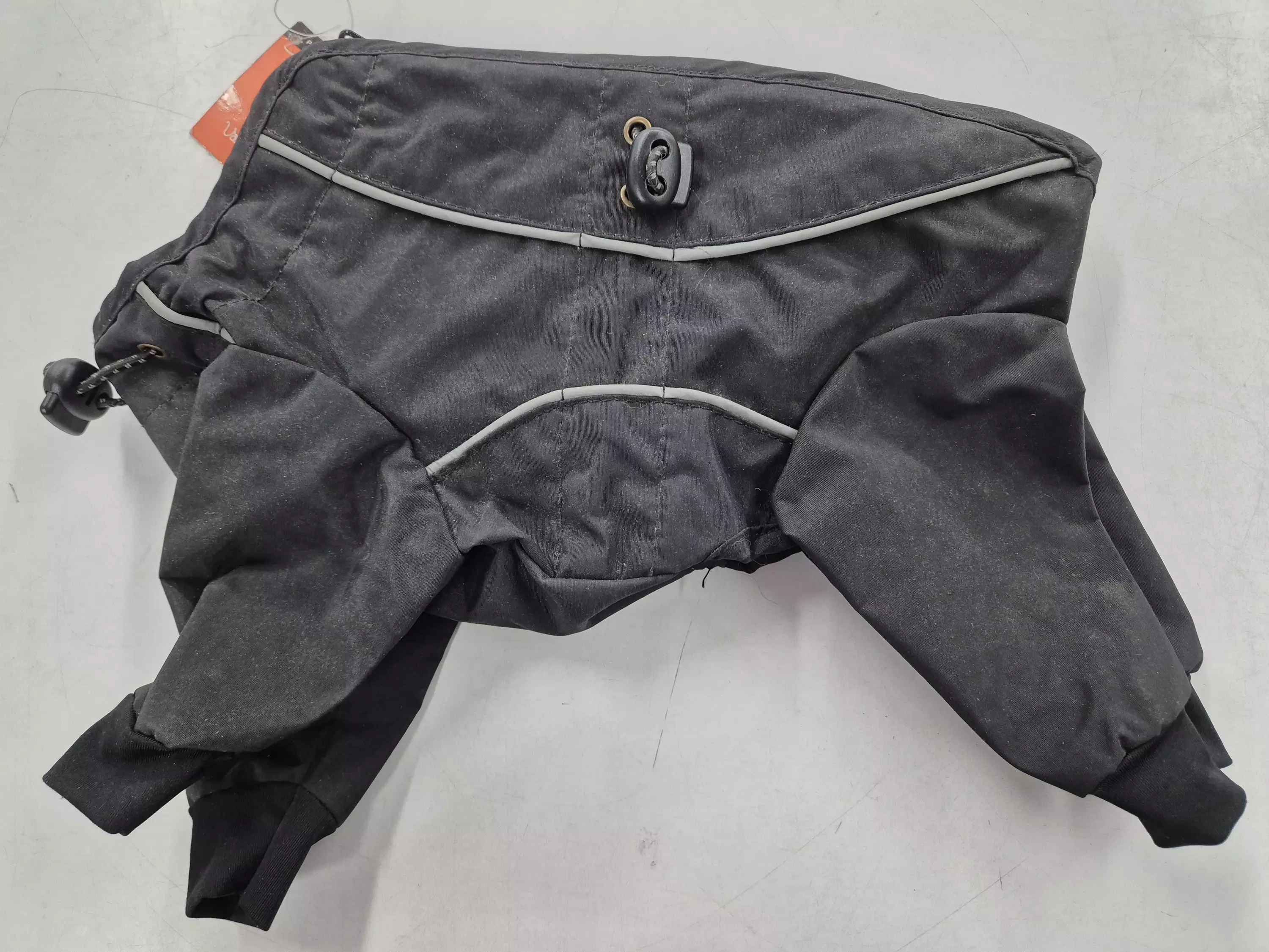 Sadehaalari koiralle. Väri musta, sivuilla heijastimet. Selän mitta noin 20 cm. Lahkeen pituus sisäreunasta noin 12 cm.