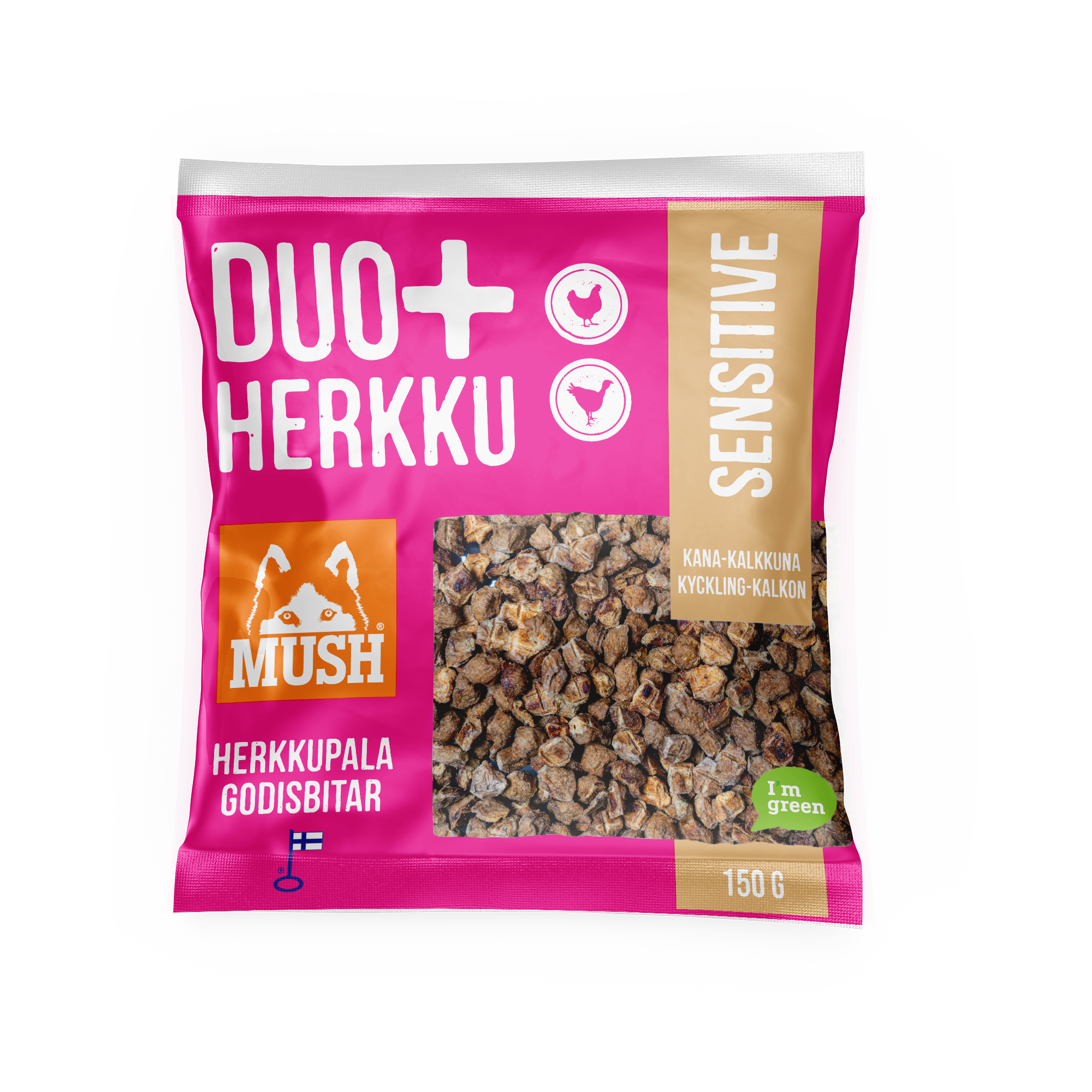 DUO+ Herkku SENSITIVE kana-kalkkuna on vitaminoitu herkkupala kaikille koirille. Pienet palat sopivat herkuttelun lisäksi hyvin mm. koulutusnameiksi.