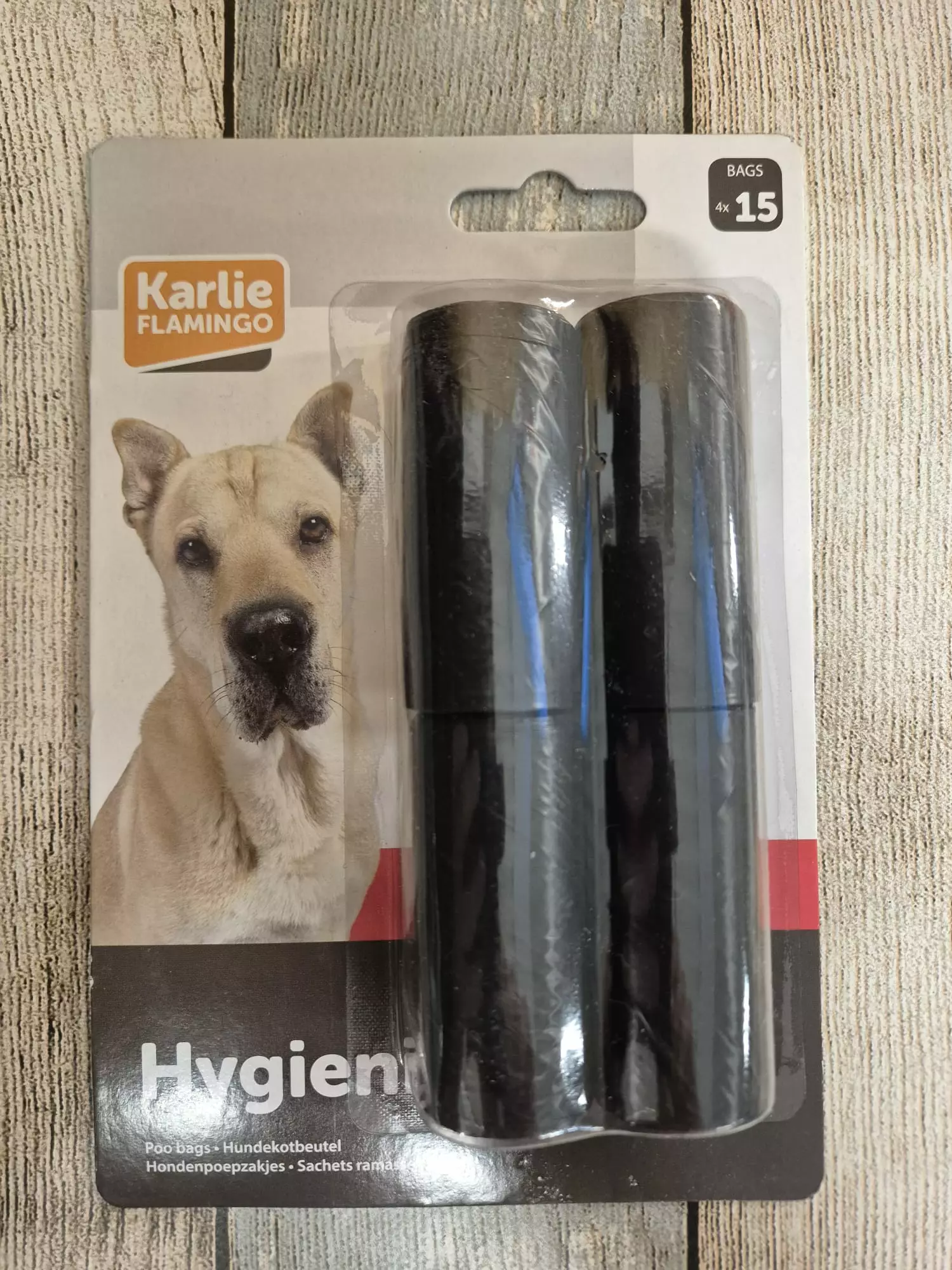 Mustia kakkapusseja säästöpakkauksessa. Pakkaus sisältää neljä rullaa, jotka sopivat useimpiin kakkapussipidikkeisiin. Jokaisessa rullassa on 15 kakkapussia.