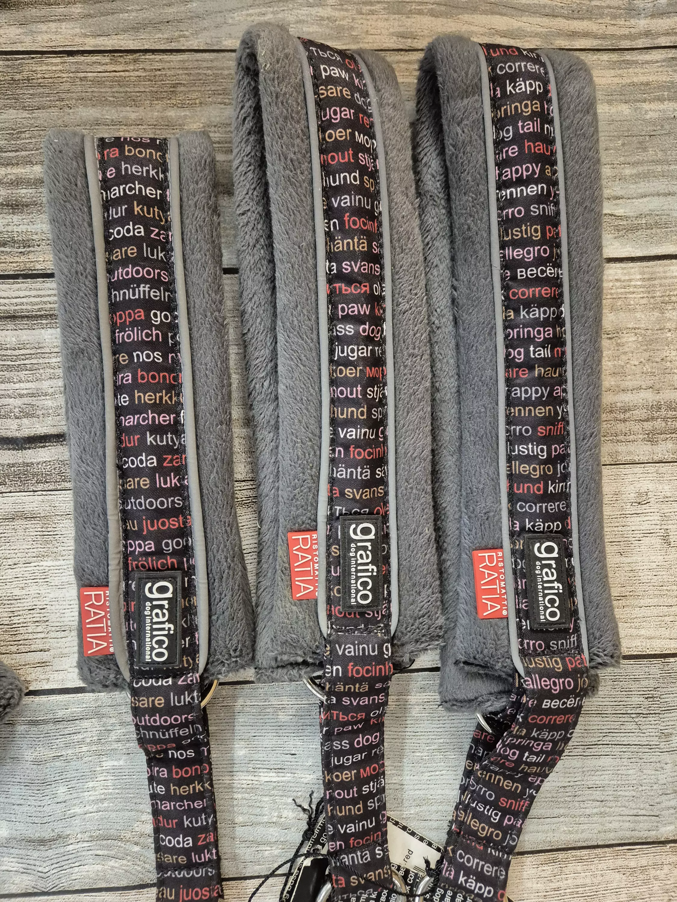 Heijastimella varustettu Ratian pehmopanta. Pehmusteena pannassa on harmaan värinen fleece, joka hellii koiran kaulaa.