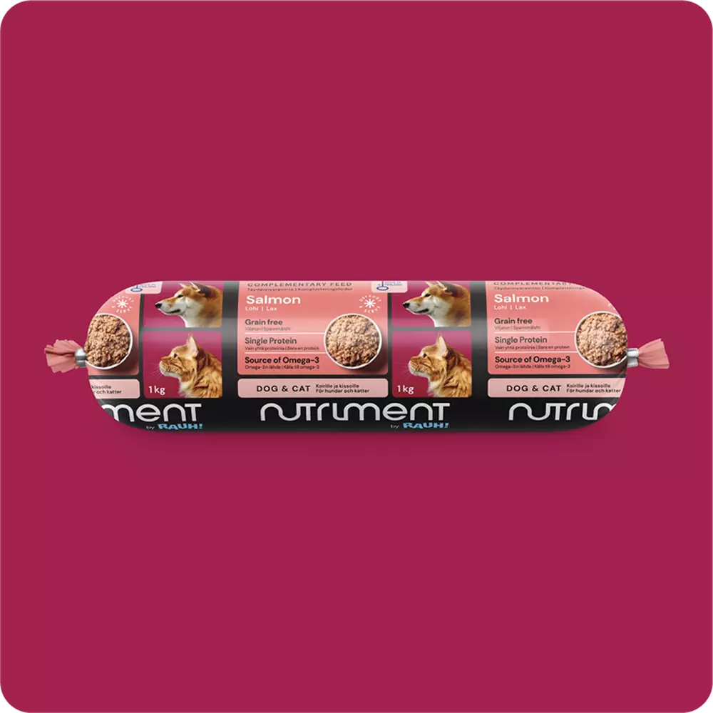 Nutriment by RAUH raakapakasteet on puhtaista raaka-aineista valmistettua raakaruokaa ilman säilöntäaineita. Sisältää ruotoineen jauhettua lohta. Sopii sekä koirille ja kissoille täydennysravinnoksi muun ravinnon lisänä. Erinomainen luontainen omega-3 lähde.