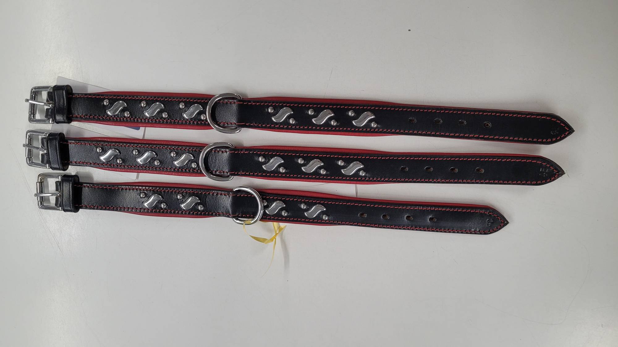 Kaksivärinen (punainen pohja ja musta päällinen) nahkapanta. Aaltoileva kuviointi pehmeän muotoisilla niiteillä. Koot: 40cm ja 45cm