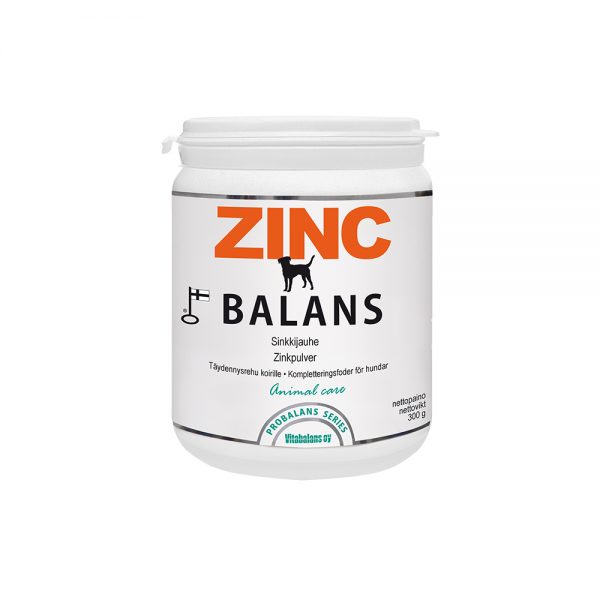 Zincbalans – sinkkijauhe koirille. Sinkki ylläpitää turkin ja ihon hyvinvointia. Se on tehokas apu iho- ja karvaongelmiin sekä kuiville anturoille ja halkeileville kynsille. Zincbalans-sinkkijauhe on helppo ja turvallinen annostella koiran painon mukaan pakkauksen mittalusikalla. Zincbalansia voidaan antaa kuurina karvanvaihdon yhteydessä sekä näyttelyihin valmistauduttaessa. Se sopii myös jatkuvaan käyttöön esimerkiksi koti- ja raakaruokavalion sinkkilisänä.